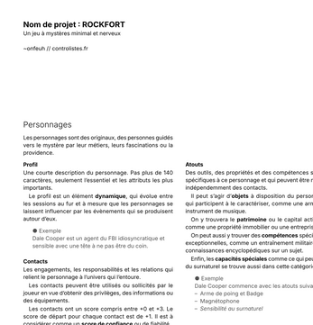 Un jeu d'enquête et de mystères inspirés par les jeux World of Darkness et Twin Peaks. Rockfort est conçu pour être accessible, autant pour les joueurs que pour l'arbitre, avec des procédures claires et explicites.